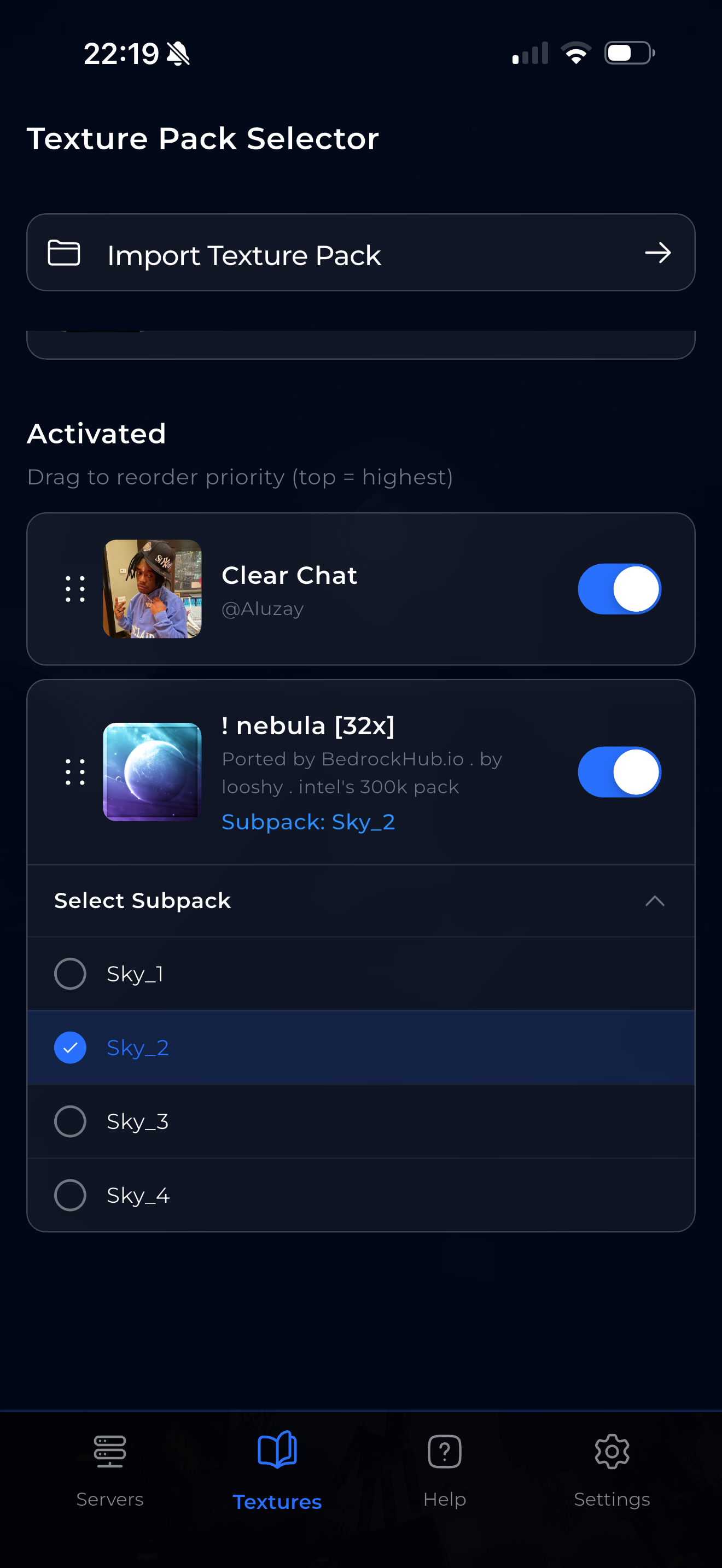 Go to the Textures tab in the app. Tap "Import Texture Pack" to add a .zip or .mcpack file. Once imported, toggle it on to activate it.
